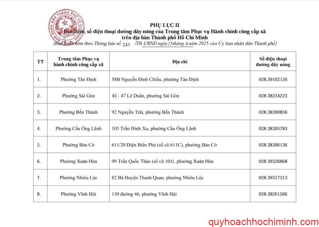 Danh sách trung tâm hành chính công cấp xã trên địa bàn Hồ Chí Minh ban hành theo thông báo 243/TB-UBND ngày 25/6/2025 STT Trung tâm Phục vụ hành chính công cấp xã Địa chỉ Số điện thoại đường dây nóng 1 Phường Tân Định 58B Nguyễn Đình Chiểu, phường Tân Định 028.39102126 2 Phường […]